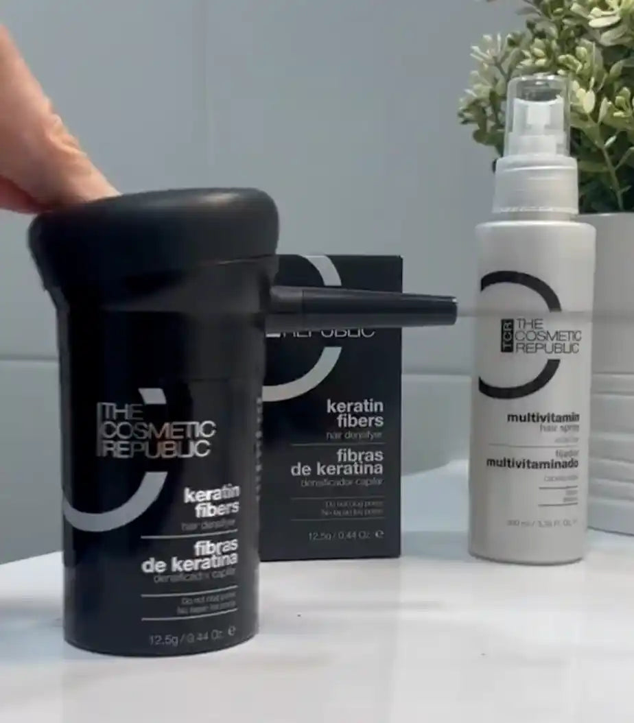Attach the Keratin Fiber Diffuser to the fiber canister and spray the fibers directly onto the bald area.