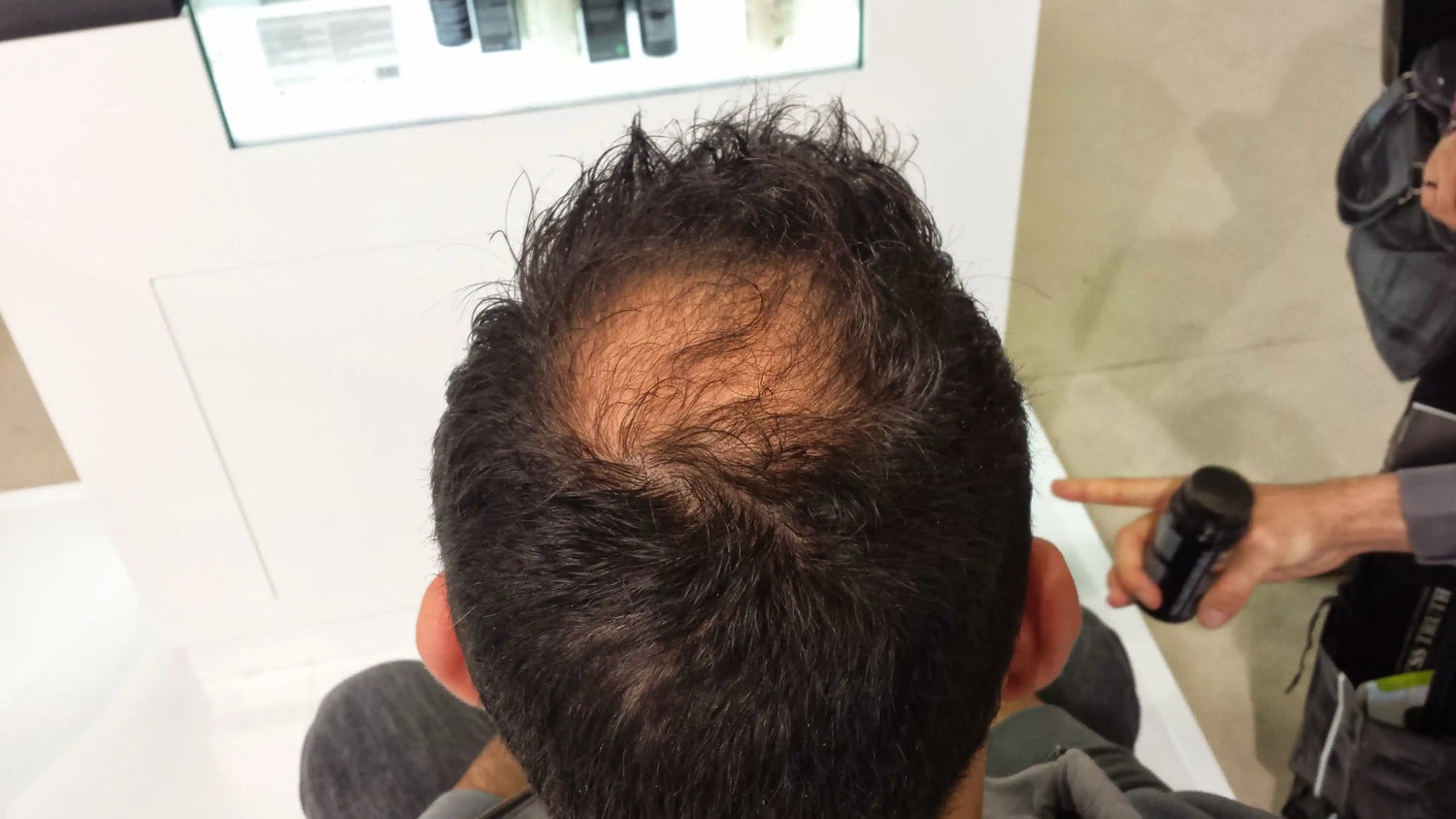 Una el Difusor de fibras de keratina al bote de las fibras y pulverice las fibras directamente sobre la zona despoblada.